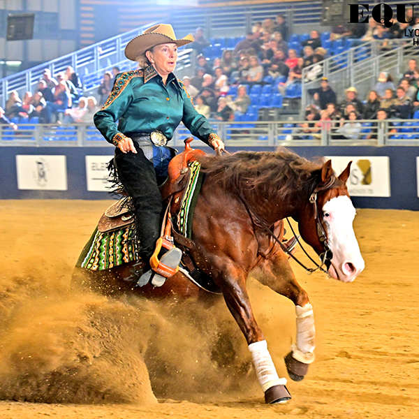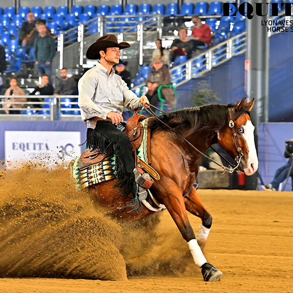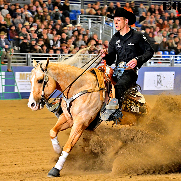 All eyes were on Arnaud Girinon and Flexing Guns N Town when they laid down a 230 in the Open Level 4 finals at the 2024 NRHA European Derby at EquitaLyon in Lyon, France. The flashy palomino, owned by Austrian Anna Scheiflinger, and the Frenchman had a perfect night with a trio of wins. Their reining trifecta included the Level 4 European Derby Open Championship, the APHA Chrome Cash Level 4 Open Championship and the top qualifying spot for the 2025 Run for a Million.